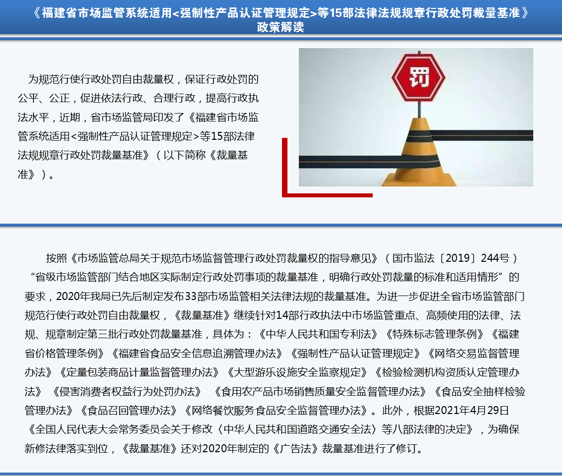 为规范行使行政处罚自由裁量权,保证行政处罚的公平、公正,促进依法行政、合理行政,提高行政执法水平,近期,九游娱乐 印发了《福建省市场监管系统适用<强制性产品认证管理规定>等15部法律法规规章行政处罚裁量基准》(以下简称《裁量基准》)。
